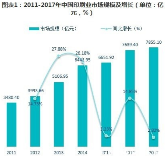 目前,印刷業(yè)已成為國民經(jīng)濟的重要組成部分之一。數(shù)據(jù)顯示,2011-2017年,我國印刷業(yè)市場規(guī)模快速增長,多個年份增速在10%以上。2017年我國印刷業(yè)市場規(guī)模為7855.10億元,同比增長2.82%。