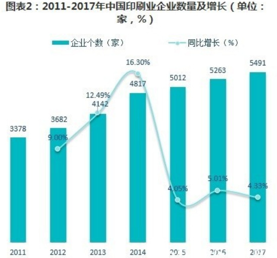 截至2017年底,我國印刷行業(yè)共有企業(yè)5491家,比上年增加了228家,同比增長4.33%,市場競爭較為激烈,且缺乏規(guī)模較大的龍頭企業(yè),上市公司營收相對于巨大的市場總量而言體量尚小。